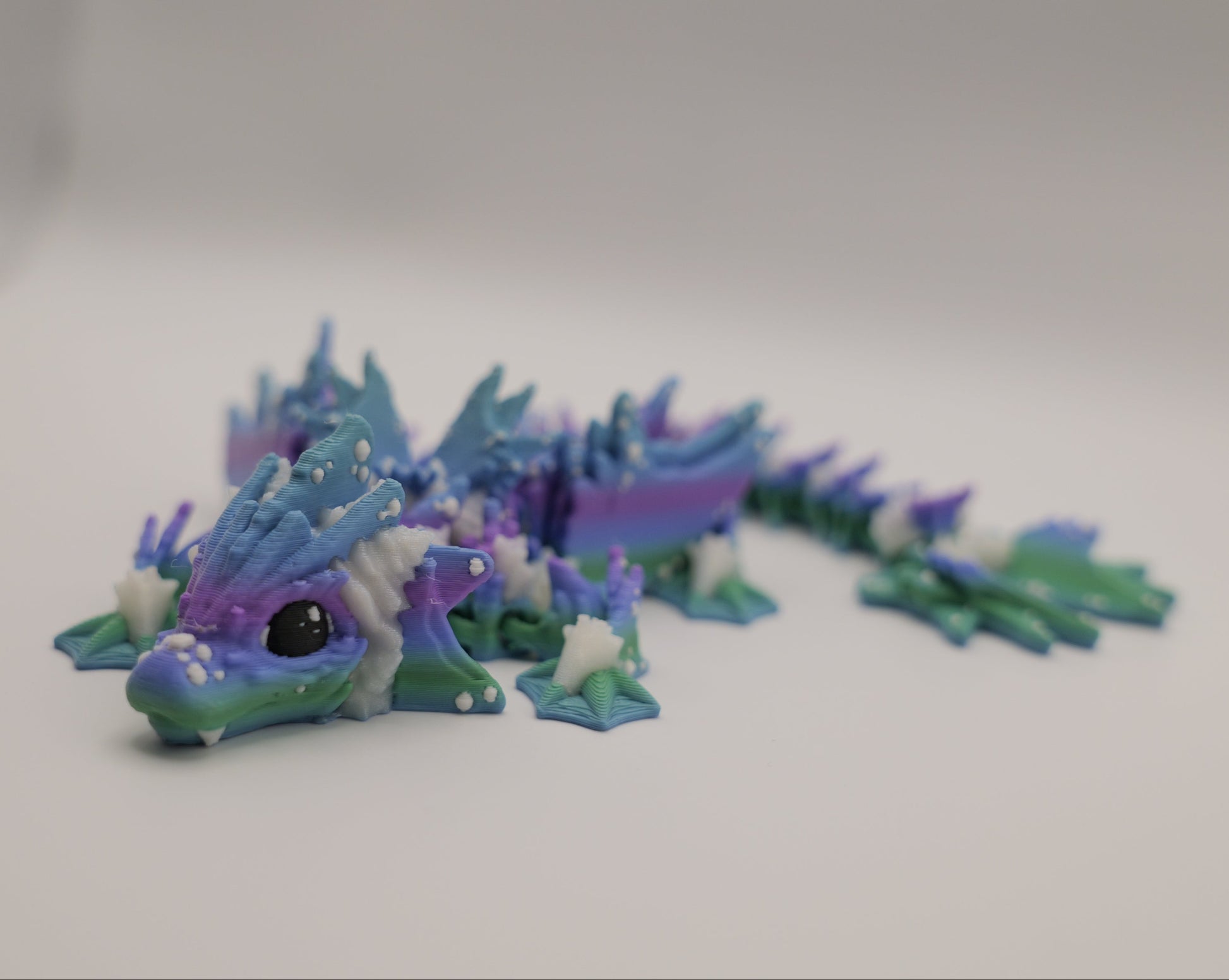 This enchanting Baby Ocean Dragon captures the colors of the sea with soft waves of teal, blue, purple, and white flowing through every layer. Printed in a shimmering gradient filament, it features delicate fins, tiny spikes, and expressive eyes that bring its oceanic charm to life. Fully articulated and smooth to move, this little dragon makes a perfect collectible or fidget companion for fantasy and ocean lovers alike.