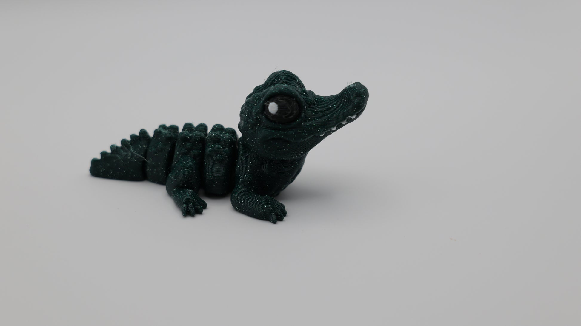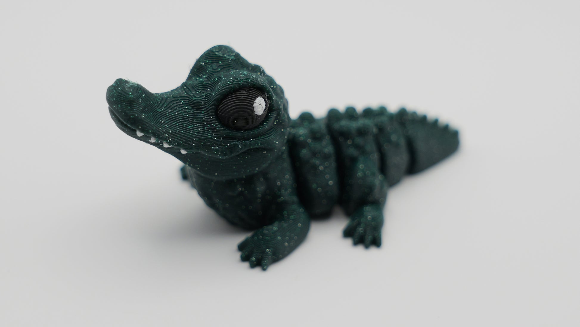 This adorable Mini Alligator combines a touch of realism with playful charm. Printed in a deep green, glittery filament, it features lifelike scales, big expressive eyes, and a smooth, flexible body for easy posing or fidgeting. Cute, curious, and full of personality — this little gator is ready to snap hearts, not fingers!